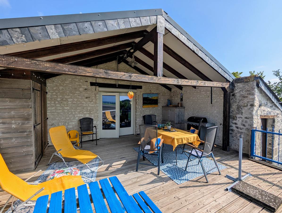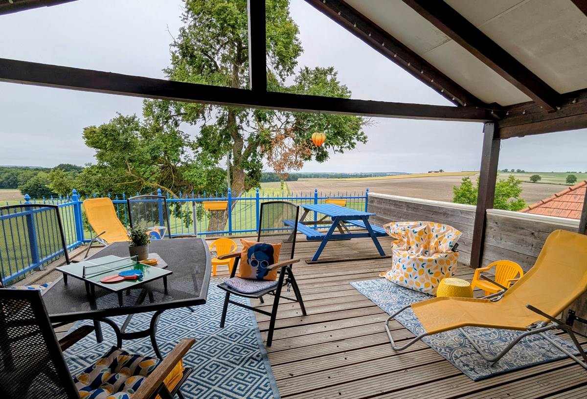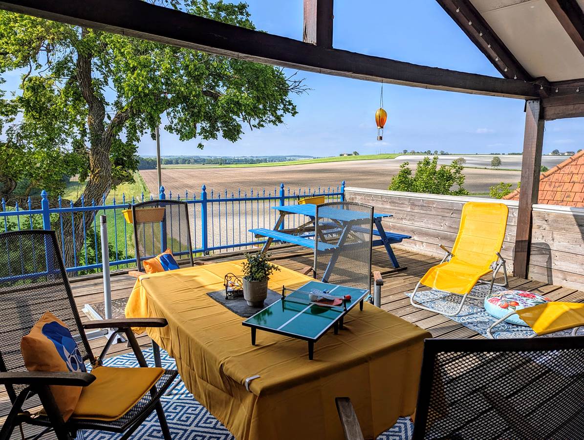 Terrasse extérieure couverte avec ping-pong, baby-foot et coin repas.